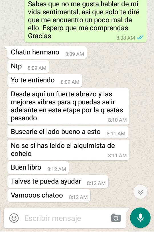 Continué bajando las escaleras sin perder la página del libro. Ya en el primer piso saqué mi celular y leí nuevamente su mensaje: "Yo no te amo. Hemos pasado toda la noche recordando lo que fuimos y lo que hicimos en todos estos años. Esto lo puedes hacer con cualquier persona que te cae bien. ¿Qué diferencia a un amigo y a un enamorado? Ayer nos besamos aun sabiendo que yo tenía pareja. Quizá, son las acciones exclusivas las que nos categorizan. El amor no puede reducirse a un intercambio de poder, pero no verlo así es un ideal. El concepto de amor que manejamos alguna vez es un ideal, por eso te digo que yo no te amo. Ha pasado tanto tiempo entre los dos que se siente claramente que no somos los que éramos. Este es ahora mi modo de pensar y sé cómo aún piensas tú. Soy mala y me he vuelto manipuladora; no quiero hacerte daño. No puedo dejar de tener por ti este sentimiento, pero sé que solo es el pasado. No deberíamos vernos más. Cuídate. No soy buena para las despedidas, así que adiós".